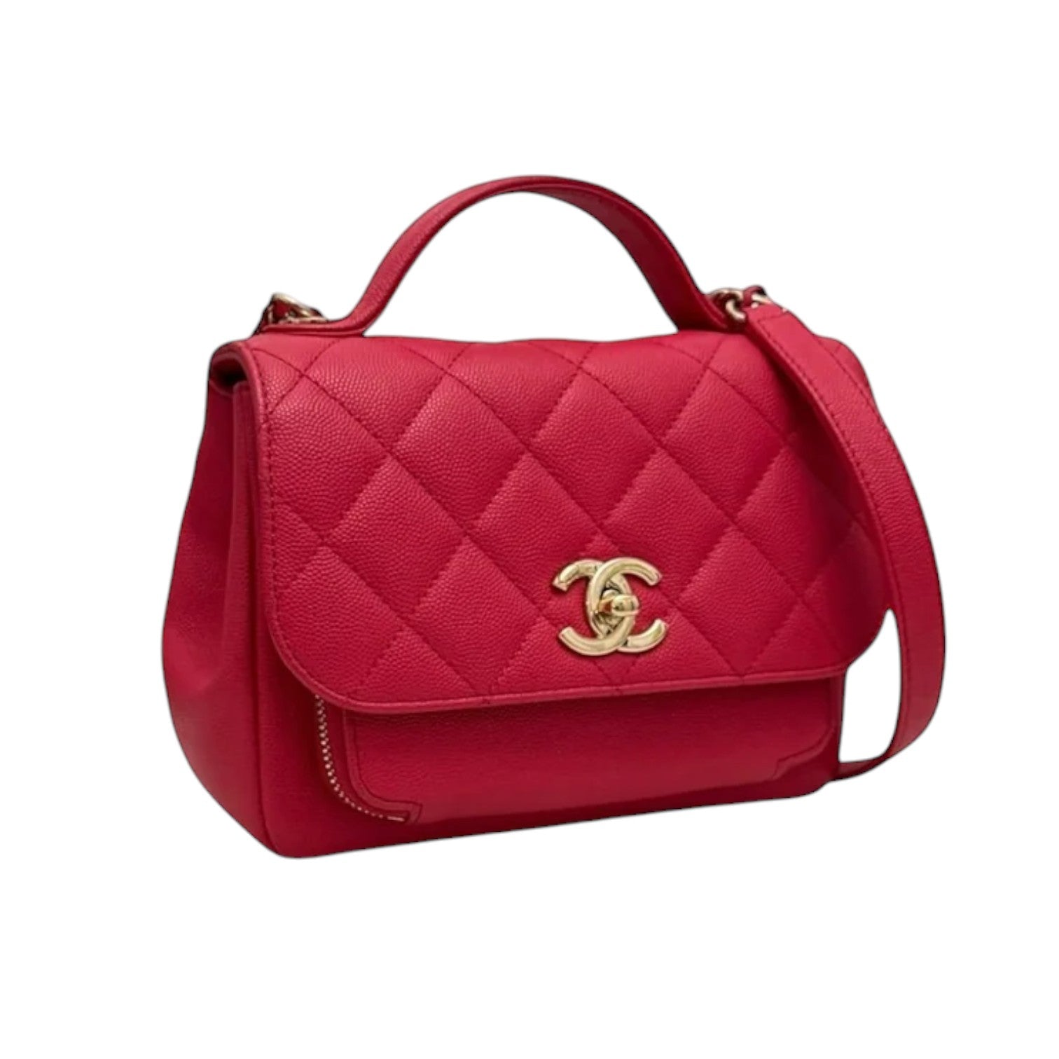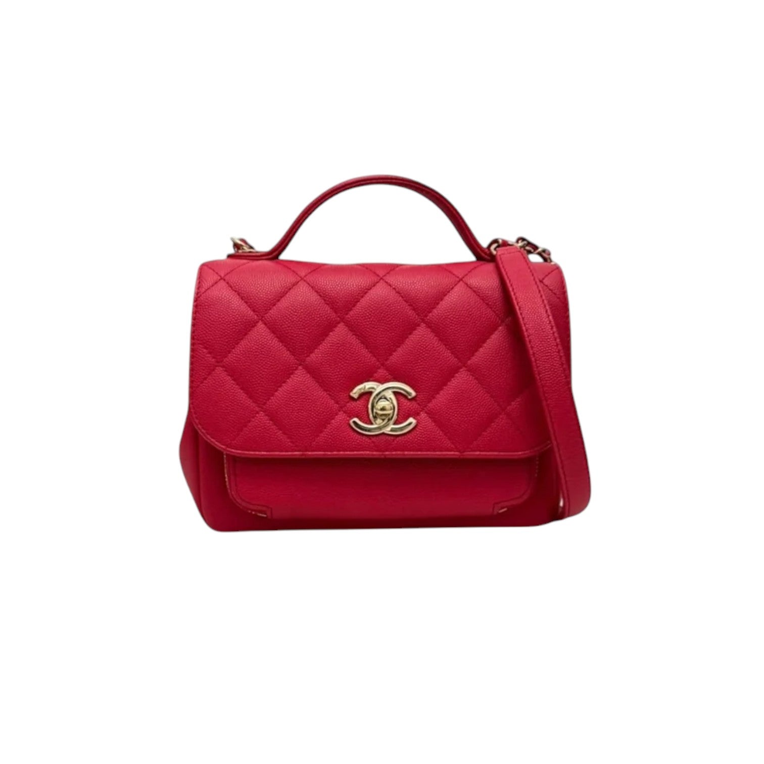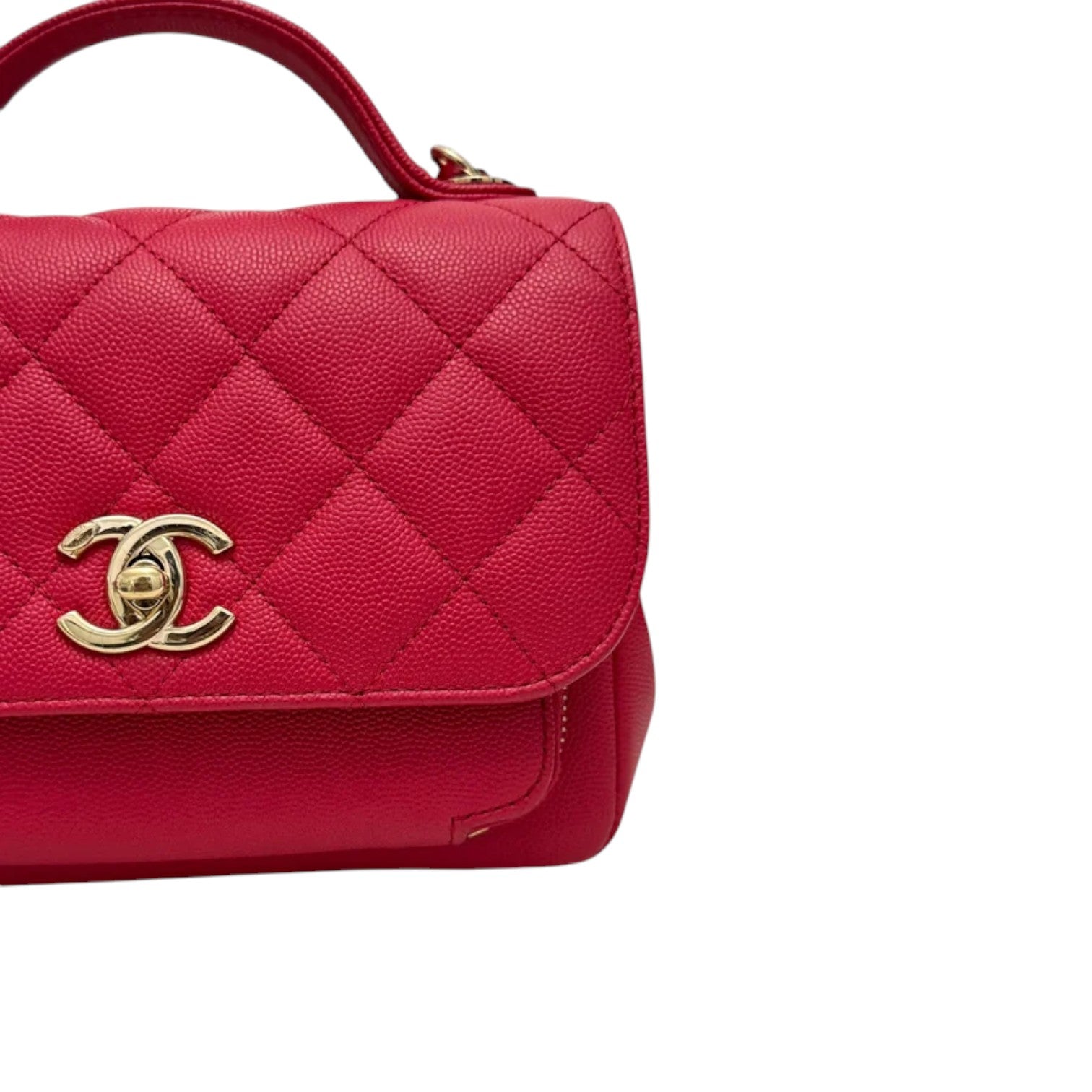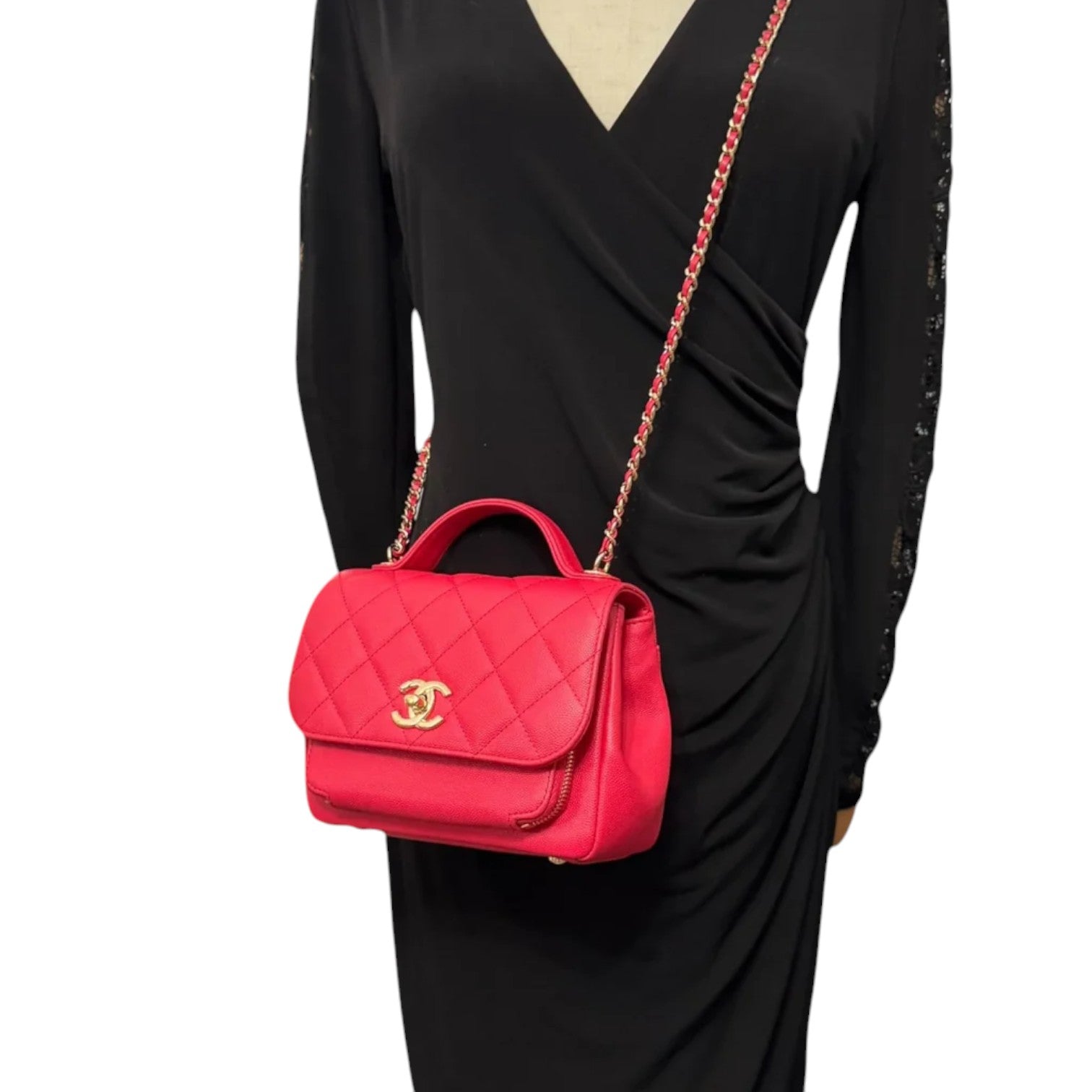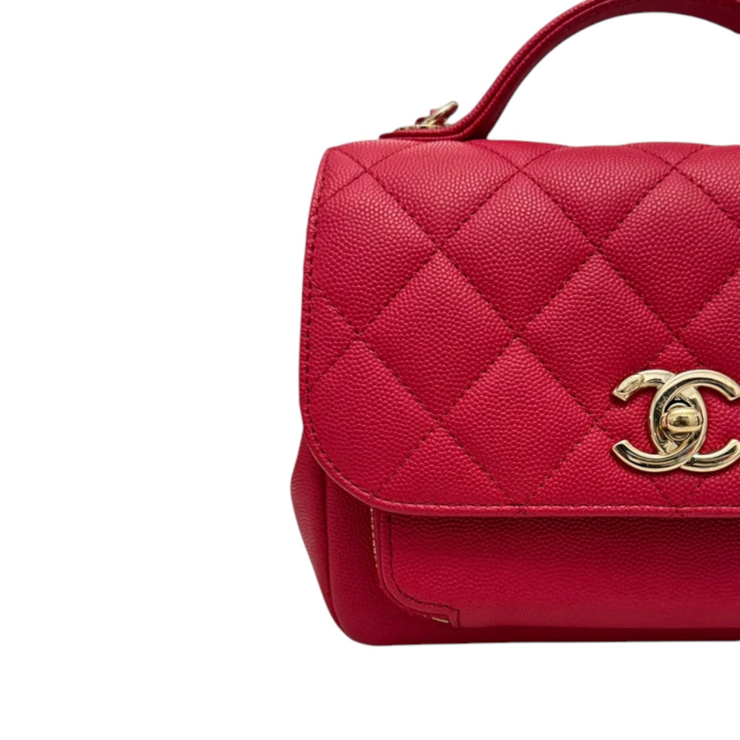 This is an authentic Chanel Business Affinity Flap Small Caviar Quilted in Red. This stylish bag is made of grained caviar calfskin leather. The shoulder bag features a sturdy leather top handle, a gold chain link leather threaded shoulder strap with a shoulder pad, a rear patch pocket, and a gold CC turn lock closure. This opens the flap to a matching leather interior with zipper and patch pockets.