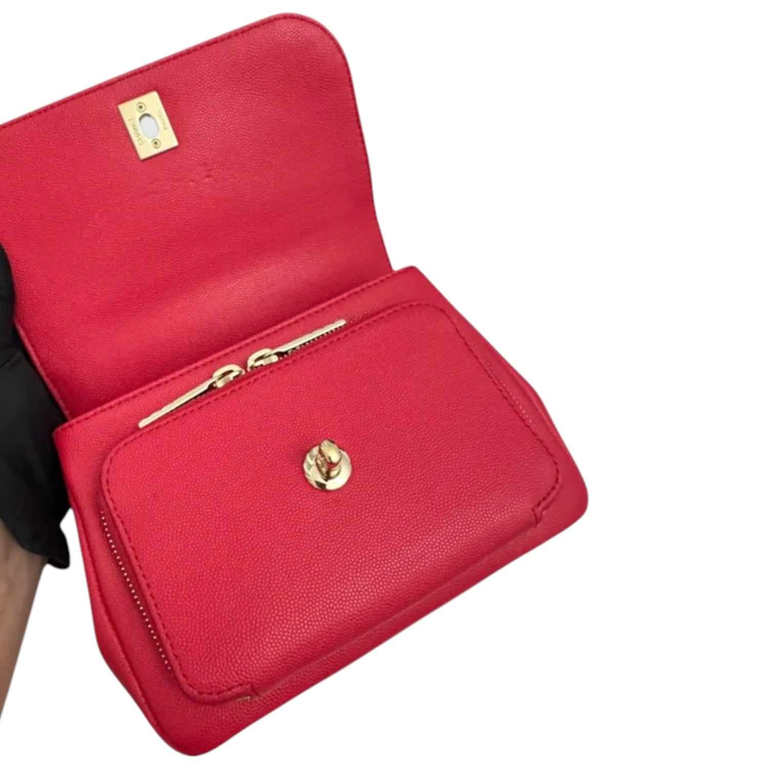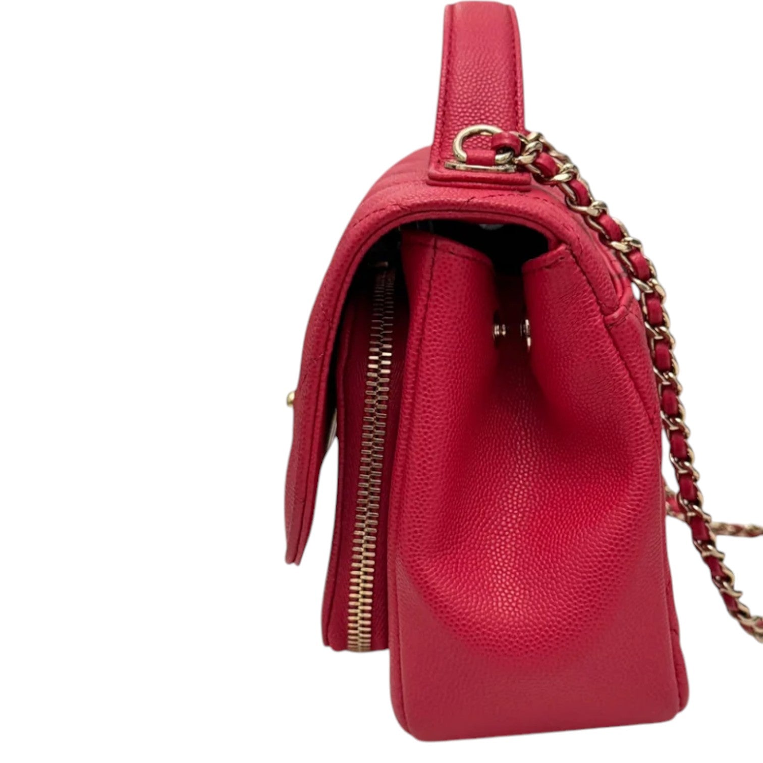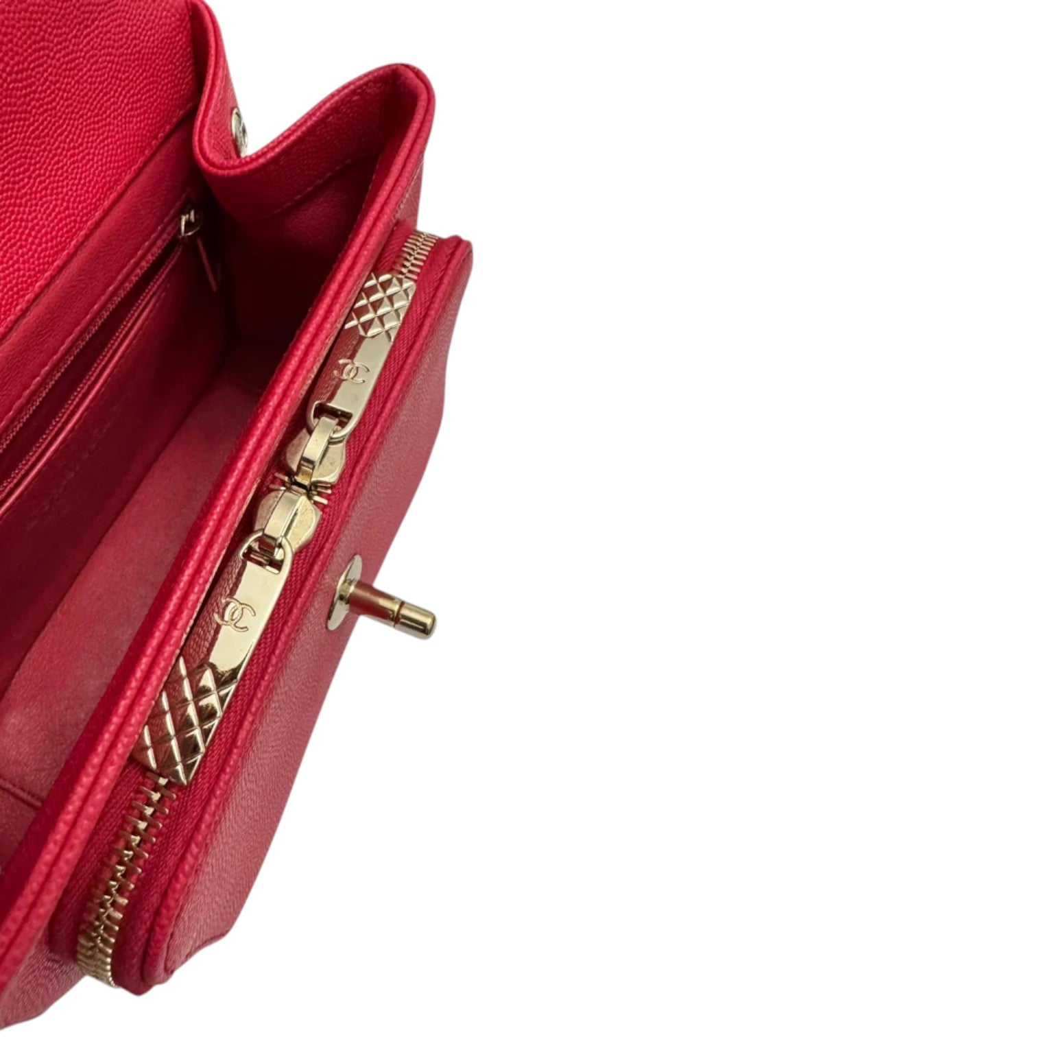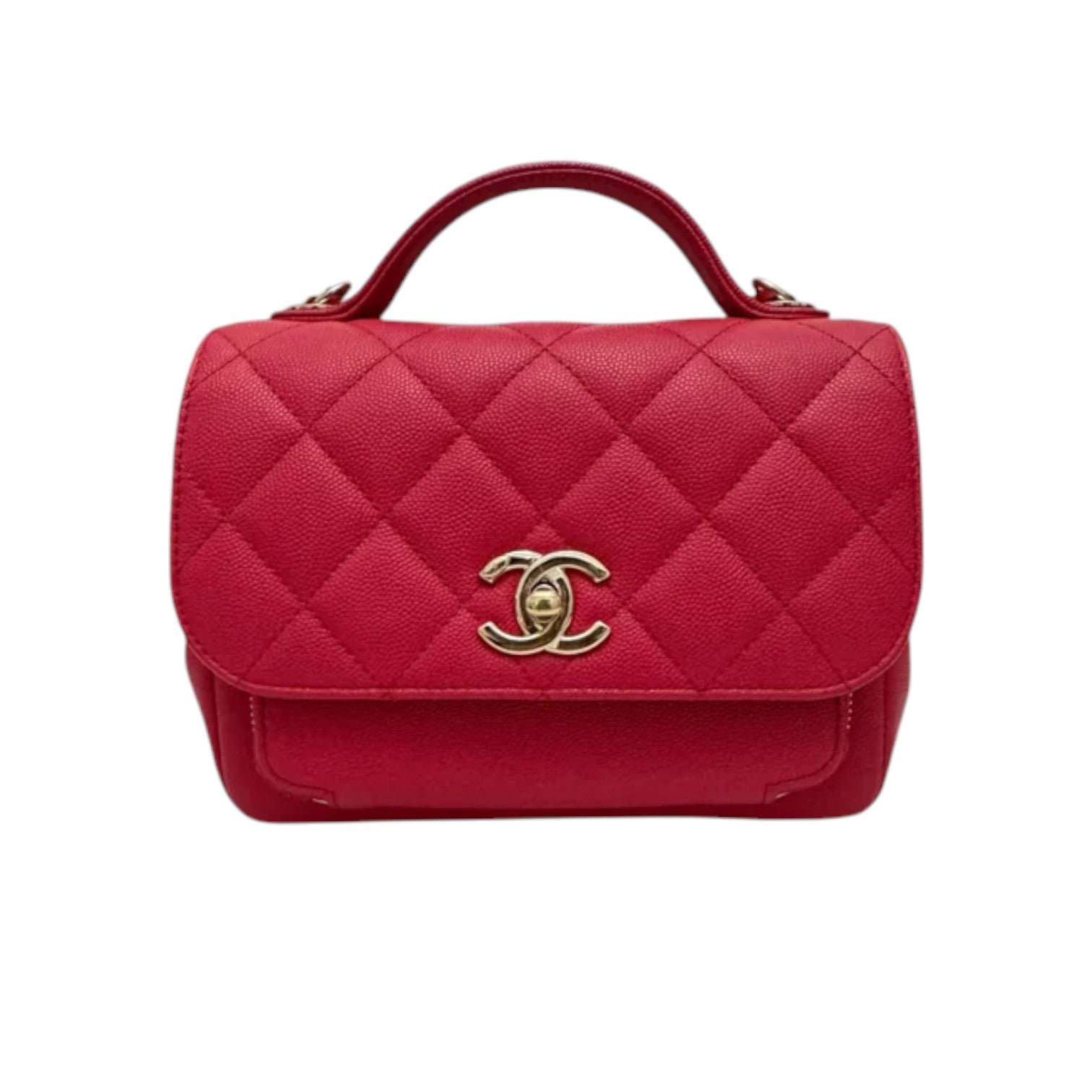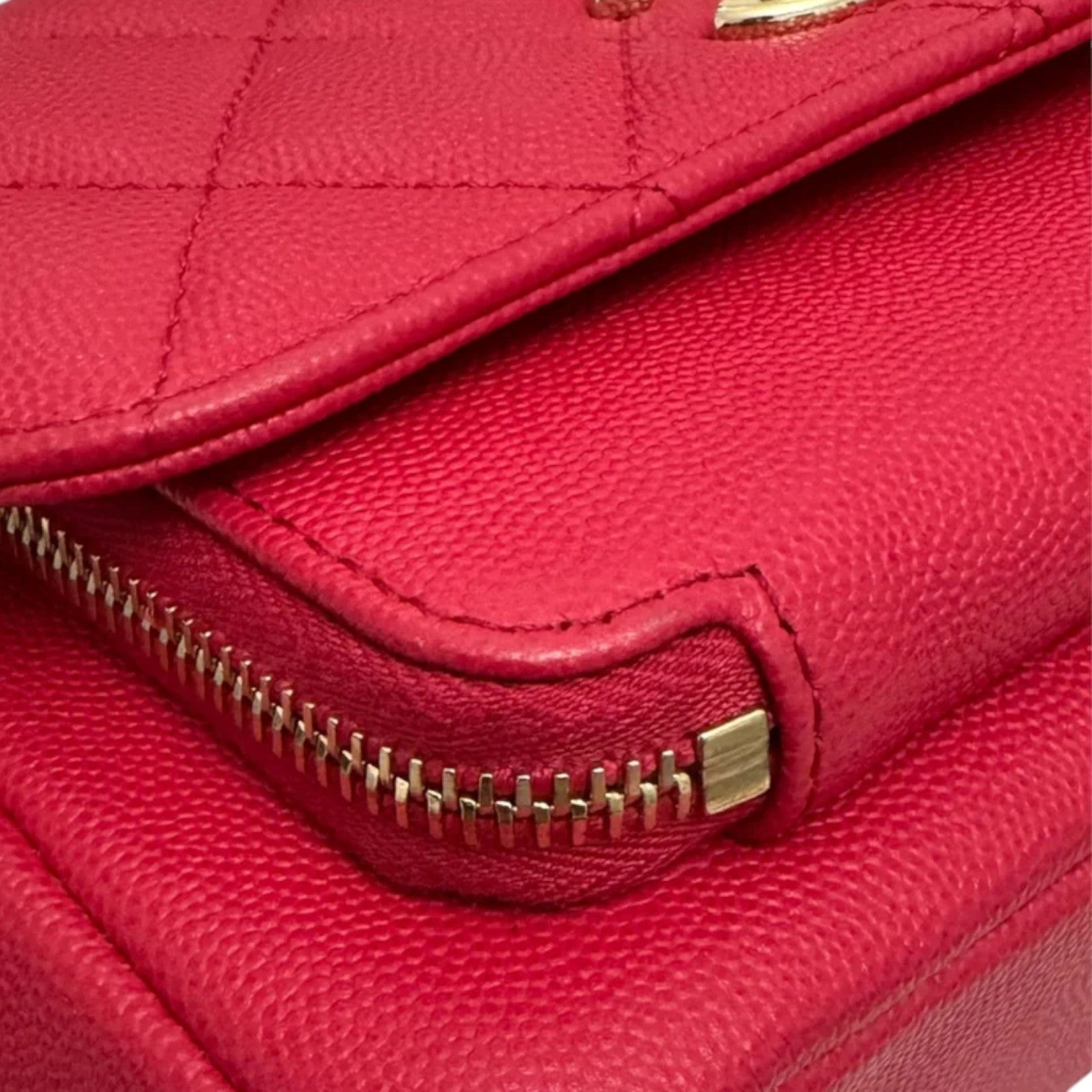 This is an authentic Chanel Business Affinity Flap Small Caviar Quilted in Red. This stylish bag is made of grained caviar calfskin leather. The shoulder bag features a sturdy leather top handle, a gold chain link leather threaded shoulder strap with a shoulder pad, a rear patch pocket, and a gold CC turn lock closure. This opens the flap to a matching leather interior with zipper and patch pockets.
