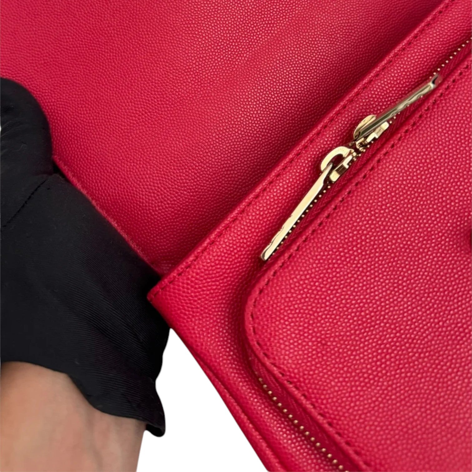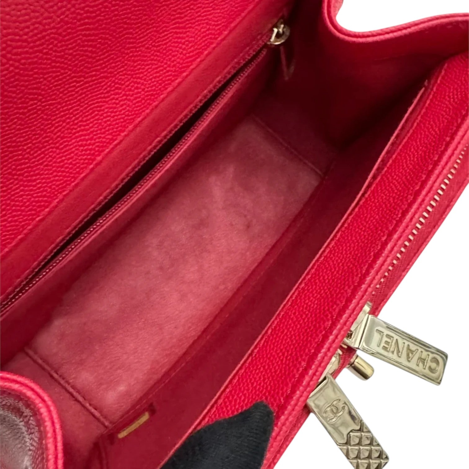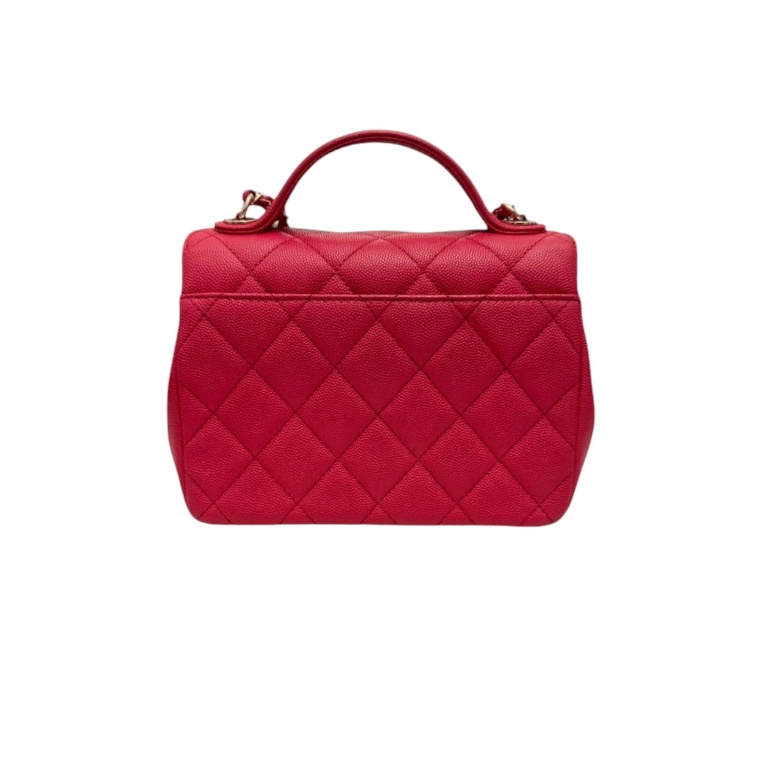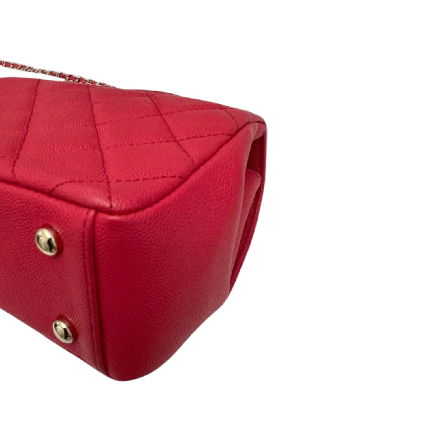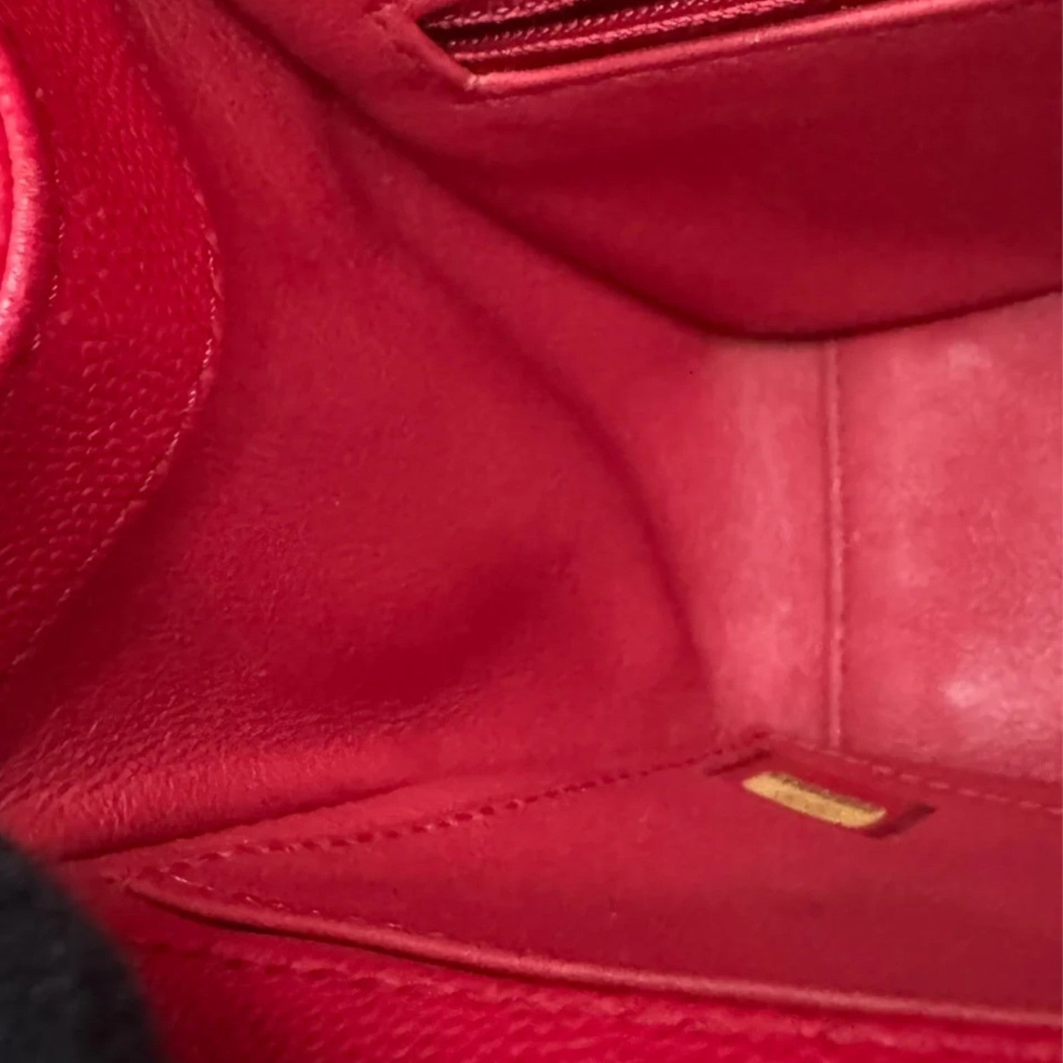 This is an authentic Chanel Business Affinity Flap Small Caviar Quilted in Red. This stylish bag is made of grained caviar calfskin leather. The shoulder bag features a sturdy leather top handle, a gold chain link leather threaded shoulder strap with a shoulder pad, a rear patch pocket, and a gold CC turn lock closure. This opens the flap to a matching leather interior with zipper and patch pockets.