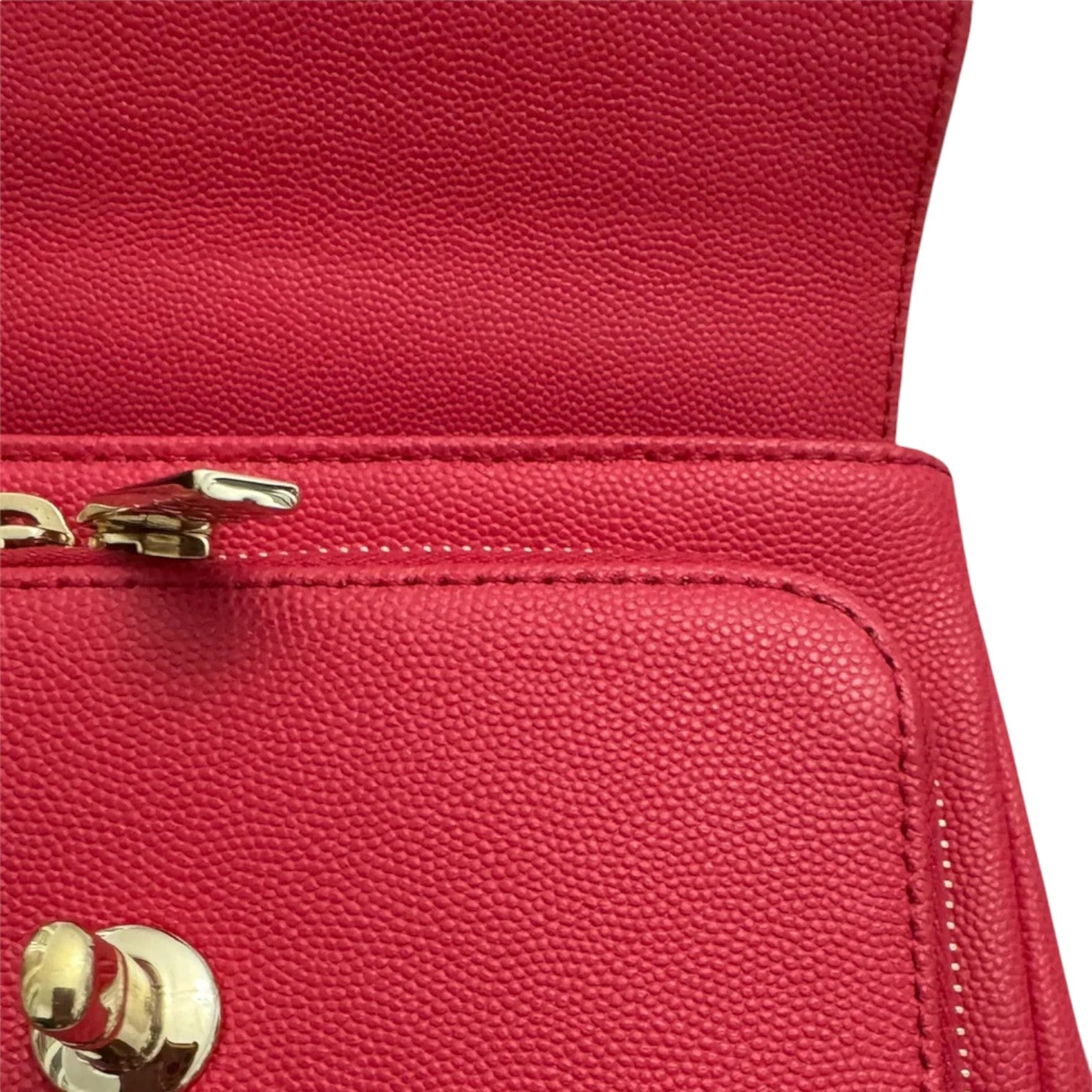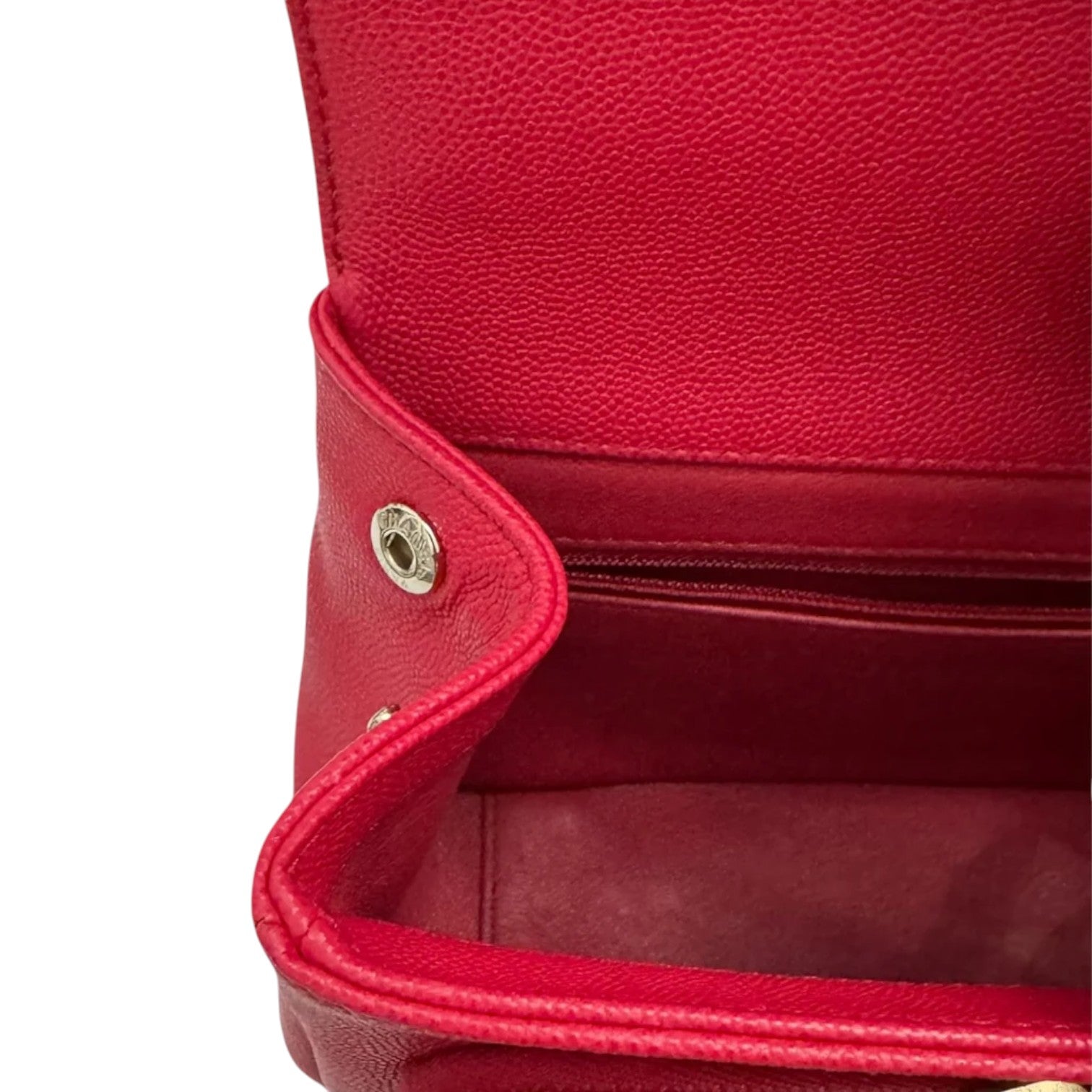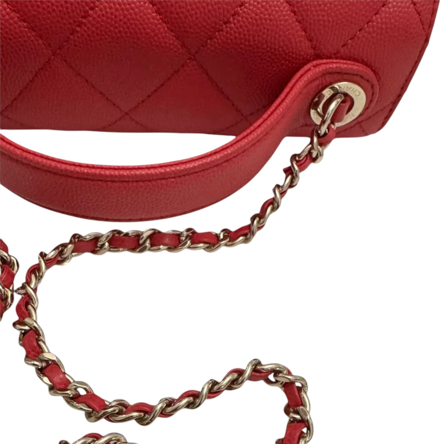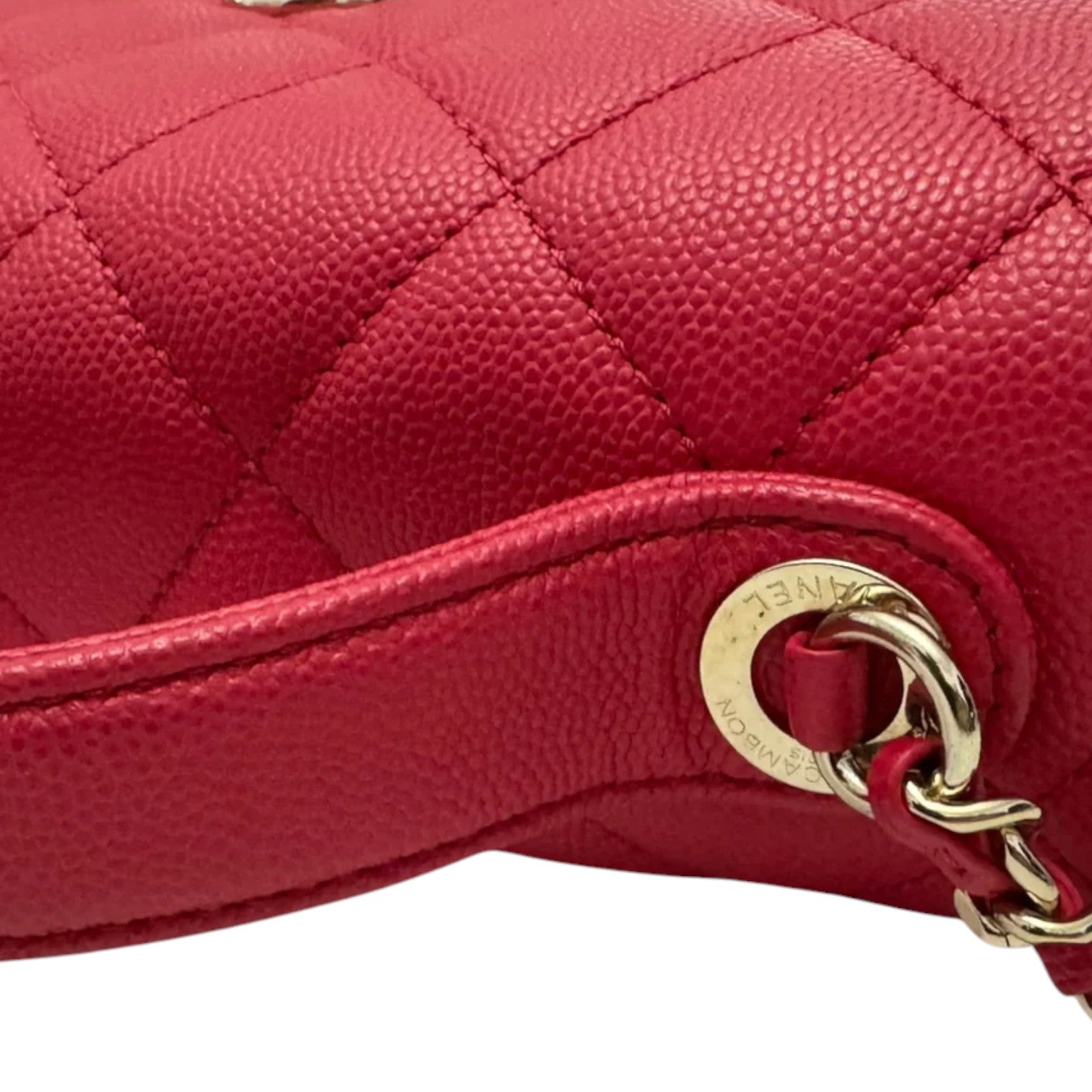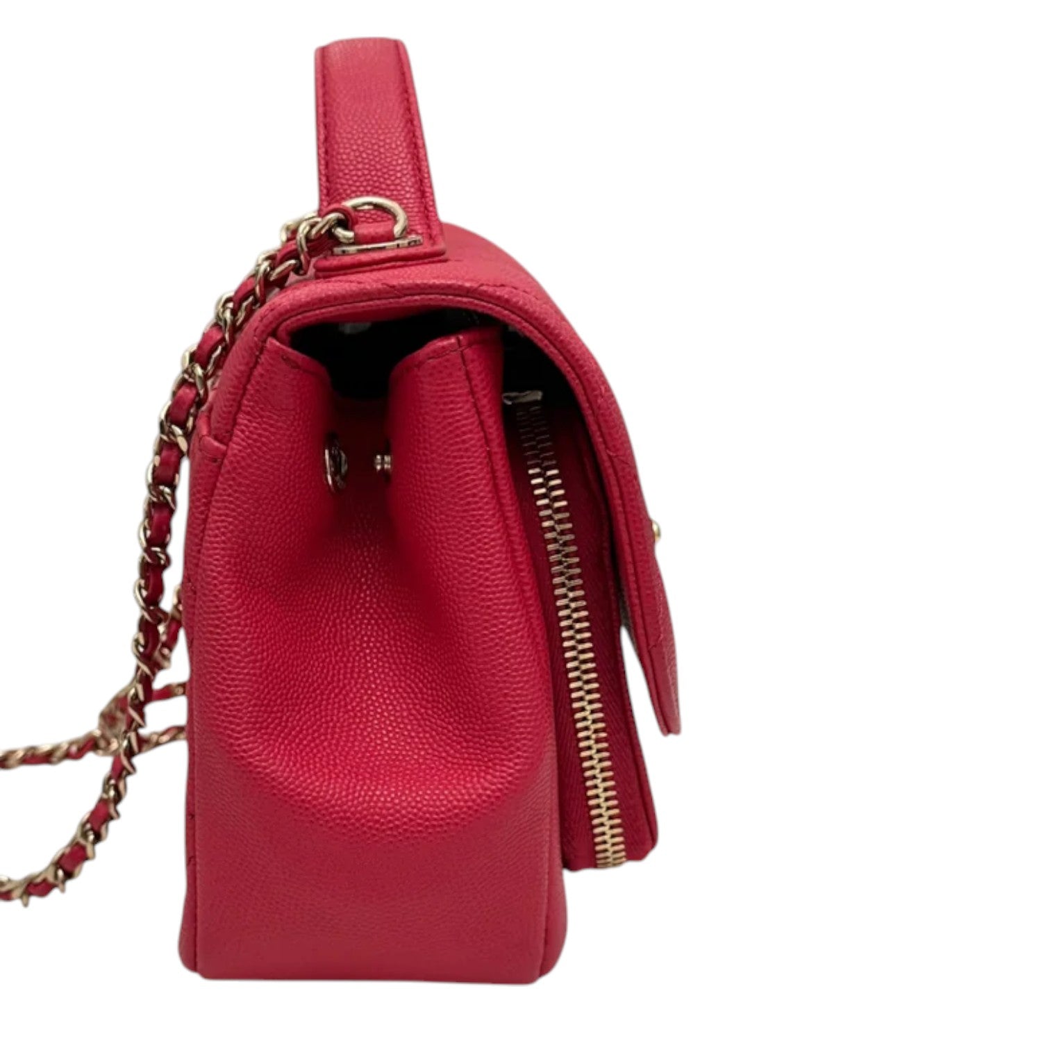 This is an authentic Chanel Business Affinity Flap Small Caviar Quilted in Red. This stylish bag is made of grained caviar calfskin leather. The shoulder bag features a sturdy leather top handle, a gold chain link leather threaded shoulder strap with a shoulder pad, a rear patch pocket, and a gold CC turn lock closure. This opens the flap to a matching leather interior with zipper and patch pockets.